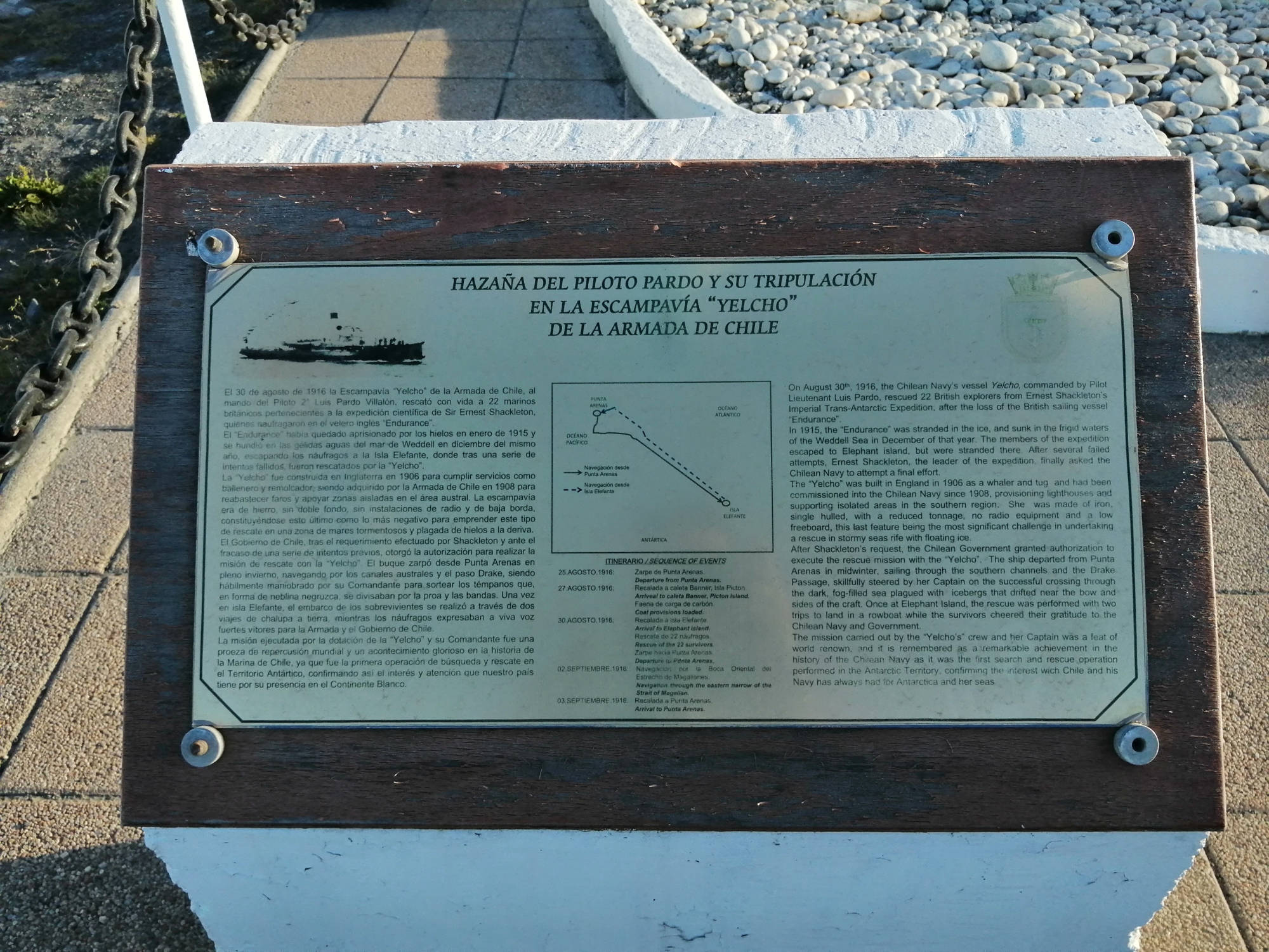 En el centro de Puerto Williams a un costado del liceo, se observa la proa de la Escampavía Yelcho, embarcación chilena que realizó el heróico rescate de la expedición antártica del irlandés Ernest Shackleton en la Isla Elefante, en territorio Antártico Chileno. El barco fue construido en 1906 y tenía 120 pies de eslora.